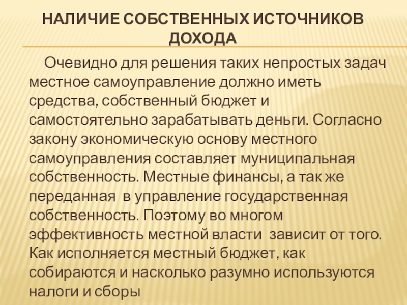 таких непростых задач местное самоуправление должно иметь средства, собственный бюджет и самостоятельно зарабатывать деньги. Согласно закону экономическую основу местного самоуправления составляет муниципальная собственность. Местные финансы, а так же переданная в управление государственная собственность. Поэтому во многом эффективность местной власти зависит от того. Как исполняется местный бюджет, как собираются и насколько разумно используются налоги и сборы
