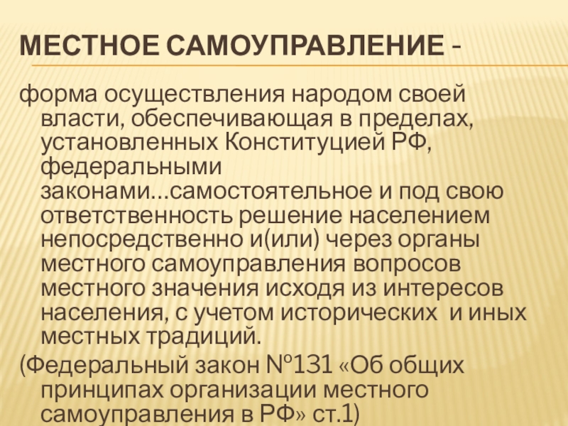 Конституцией РФ, федеральными законами…самостоятельное и под свою ответственность решение населением непосредственно и(или) через органы местного самоуправления вопросов местного значения исходя из интересов населения, с учетом исторических и иных местных традиций.