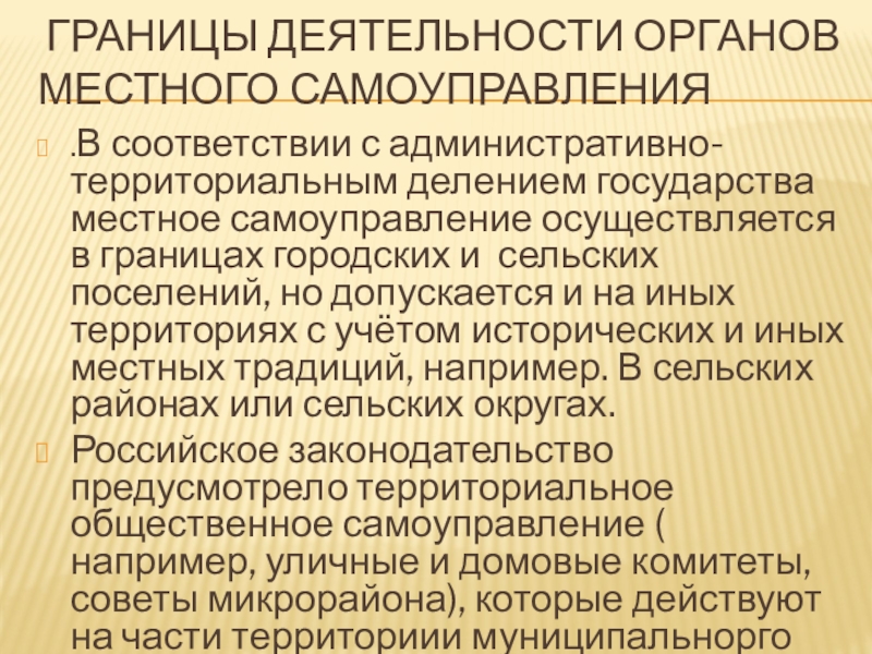 Российское законодательство предусмотрело территориальное общественное самоуправление ( например, уличные и домовые комитеты, советы микрорайона), которые действуют на части территориии муниципальнорго образования