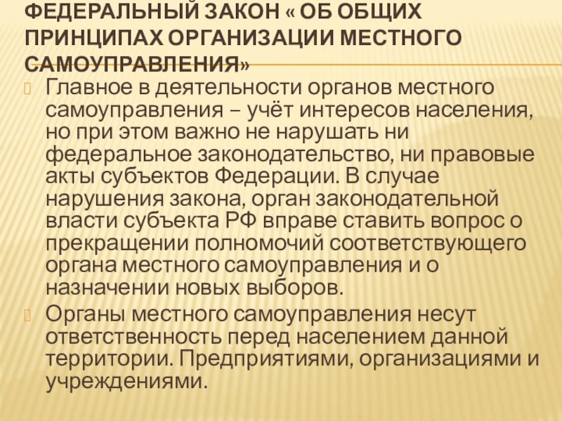органов местного самоуправления – учёт интересов населения, но при этом важно не нарушать ни федеральное законодательство, ни правовые акты субъектов Федерации. В случае нарушения закона, орган законодательной власти субъекта РФ вправе ставить вопрос о прекращении полномочий соответствующего органа местного самоуправления и о назначении новых выборов.