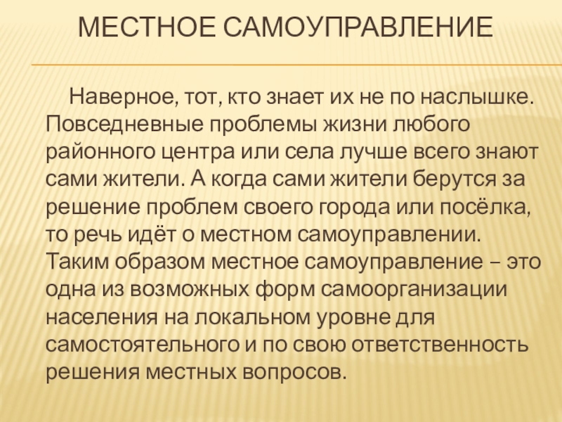 не по наслышке. Повседневные проблемы жизни любого районного центра или села лучше всего знают сами жители. А когда сами жители берутся за решение проблем своего города или посёлка, то речь идёт о местном самоуправлении. Таким образом местное самоуправление – это одна из возможных форм самоорганизации населения на локальном уровне для самостоятельного и по свою ответственность решения местных вопросов.