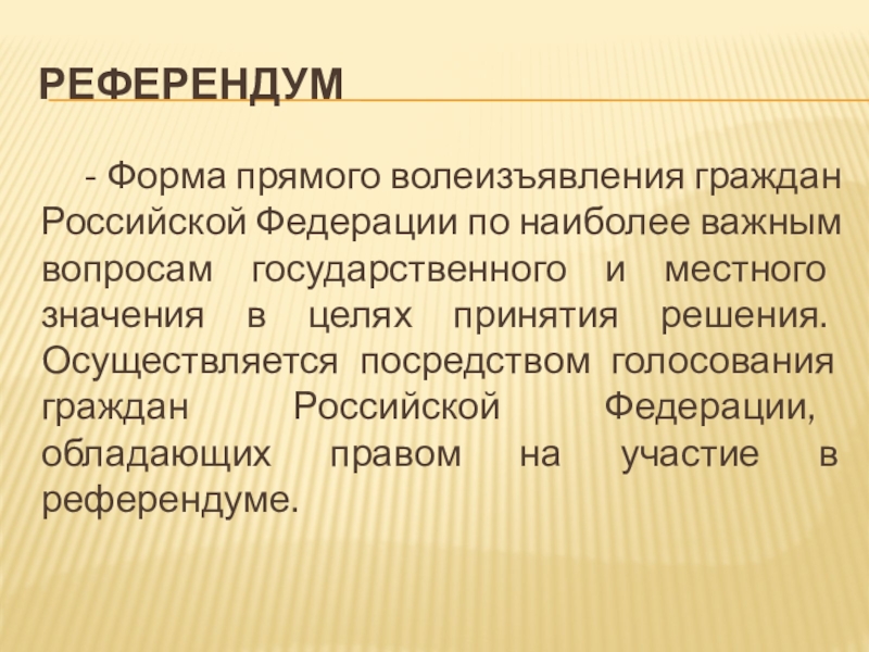 Федерации по наиболее важным вопросам государственного и местного значения в целях принятия решения. Осуществляется посредством голосования граждан Российской Федерации, обладающих правом на участие в референдуме.