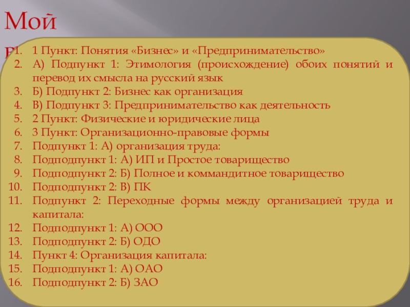 Составьте план, в соответствии с которым вы будете освещать эту тему. План должен содержать не менее трех пунктов, из которых два или более детализированы в подпунктах.