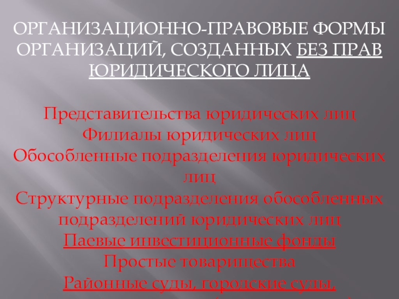 Слайд 12ОРГАНИЗАЦИОННО-ПРАВОВЫЕ ФОРМЫ ОРГАНИЗАЦИЙ, СОЗДАННЫХ БЕЗ ПРАВ ЮРИДИЧЕСКОГО ЛИЦА