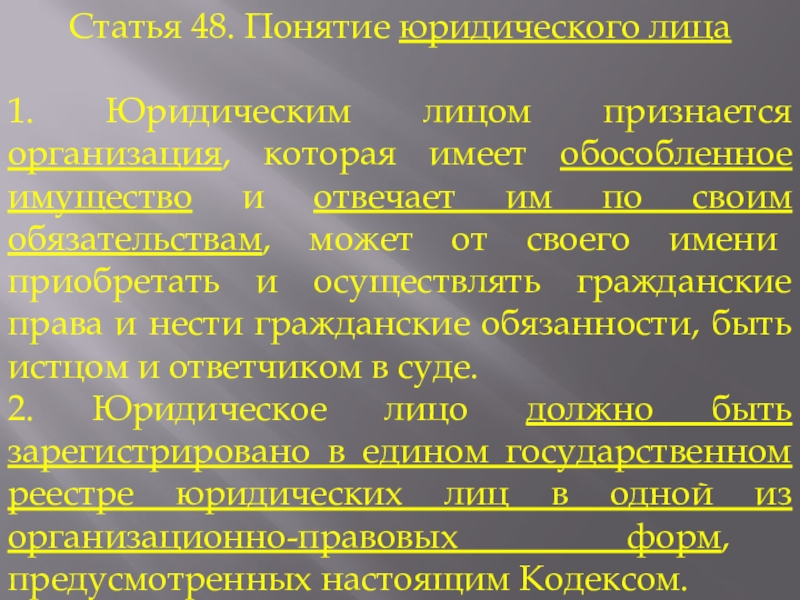 Слайд 9Статья 48. Понятие юридического лица