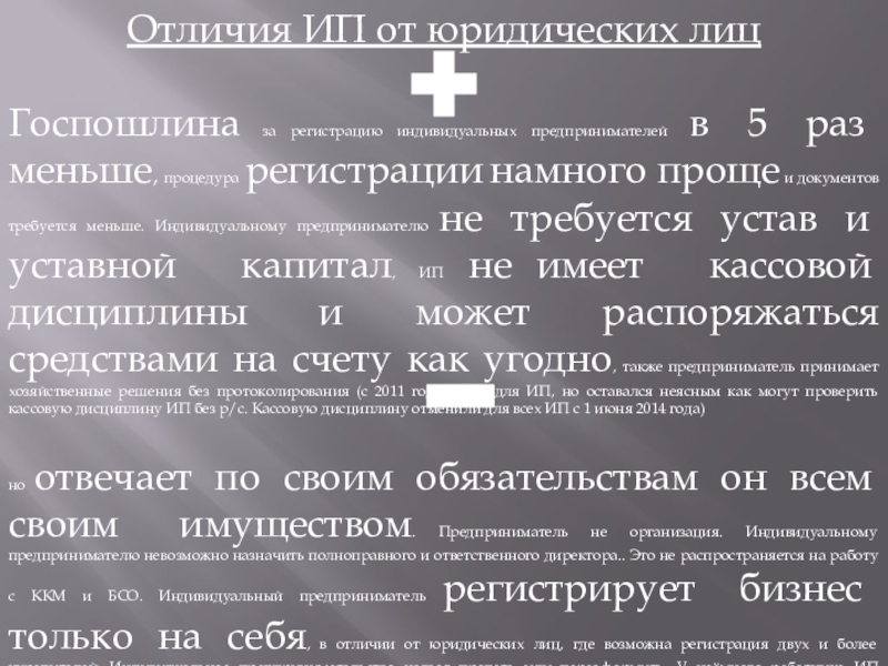 раз меньше, процедура регистрации намного проще и документов требуется меньше. Индивидуальному предпринимателю не требуется устав и уставной капитал, ИП не имеет кассовой дисциплины и может распоряжаться средствами на счету как угодно, также предприниматель принимает хозяйственные решения без протоколирования (с 2011 года ввели для ИП, но оставался неясным как могут проверить кассовую дисциплину ИП без р/с. Кассовую дисциплину отменили для всех ИП с 1 июня 2014 года)
