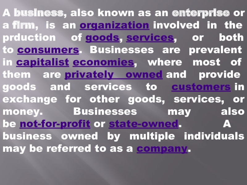 Слайд 4A business, also known as an enterprise or a firm, is an organization involved in the prduction