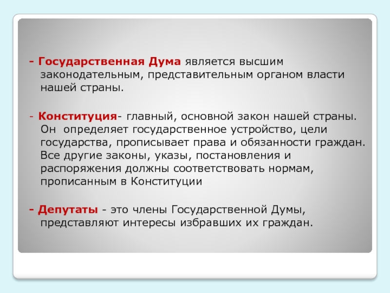 - Государственная Дума является высшим законодательным, представительным органом власти нашей страны. - Конституция- главный, основной закон нашей