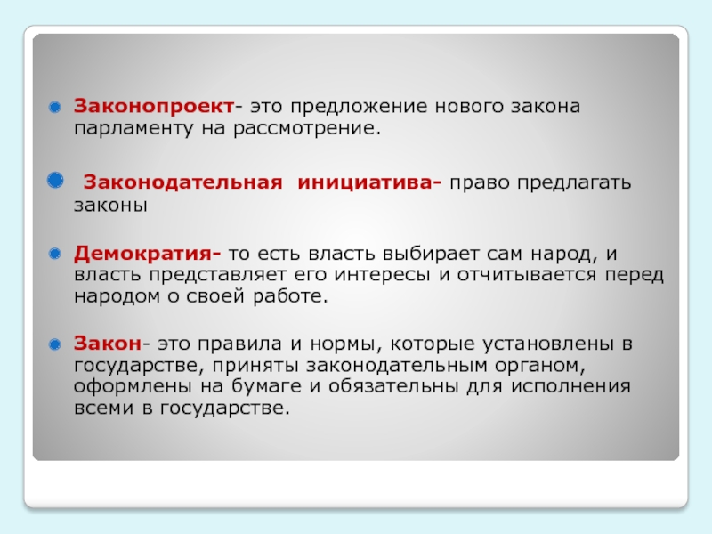 Законопроект- это предложение нового закона парламенту на рассмотрение.