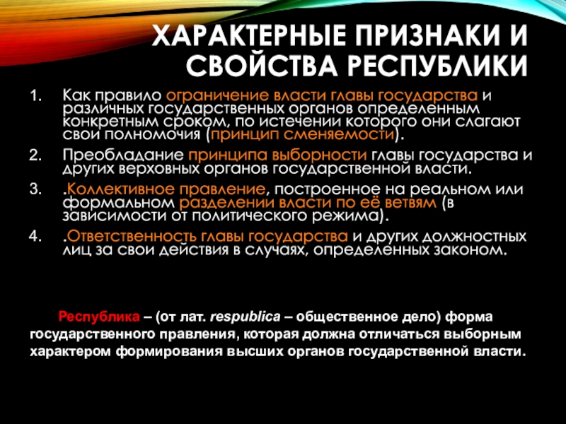 Республика – (от лат. respublica – общественное дело) форма государственного правления, которая должна отличаться выборным характером формирования высших органов государственной власти.
