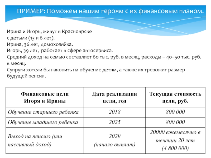 ПРИМЕР: Поможем нашим героям с их финансовым планом.