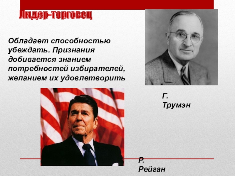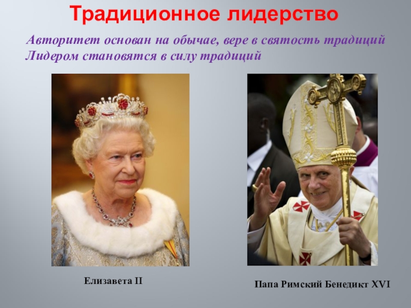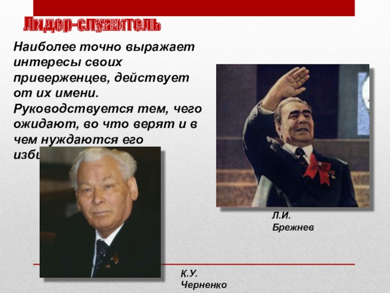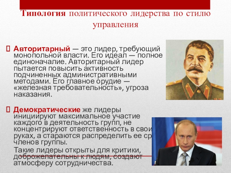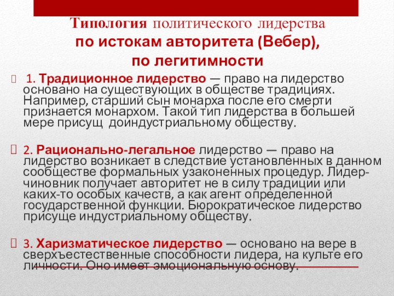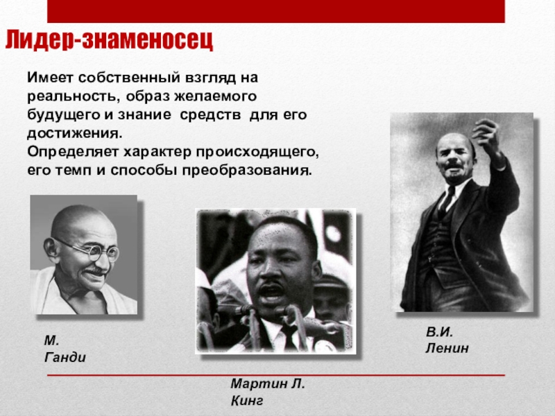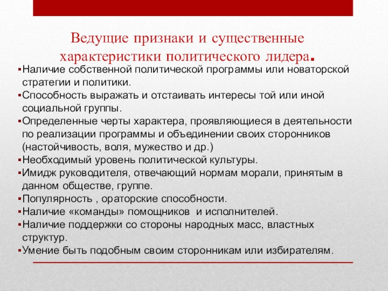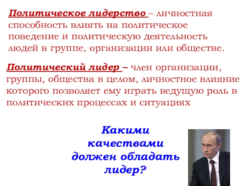 Политический лидер – член организации, группы, общества в целом, личностное влияние которого позволяет ему играть ведущую роль в политических процессах и ситуациях