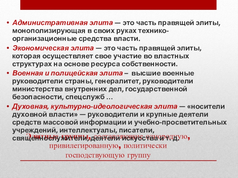 Относительно немногочисленная социальная группа, сосредоточившая в своих руках значительный объем власти