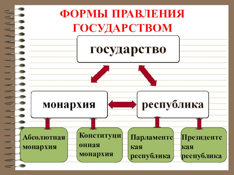 ФОРМЫ ПРАВЛЕНИЯ ГОСУДАРСТВОМАбсолютная монархияКонституционная монархияПарламентская республикаПрезидентская республика