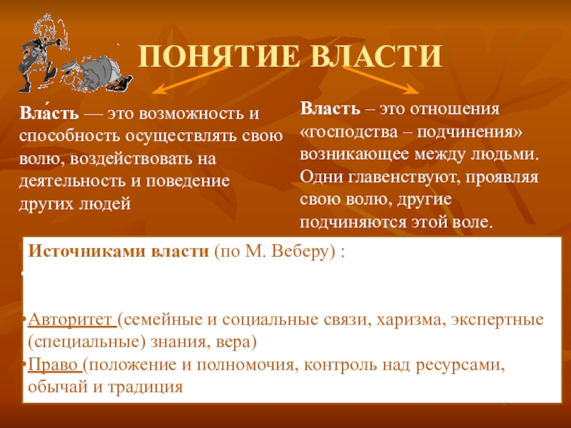 Власть – это отношения «господства – подчинения» возникающее между людьми. Одни главенствуют, проявляя свою волю, другие подчиняются этой воле.