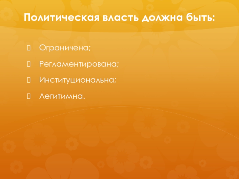 Политическая власть должна быть:Ограничена;Регламентирована;Институциональна;Легитимна.