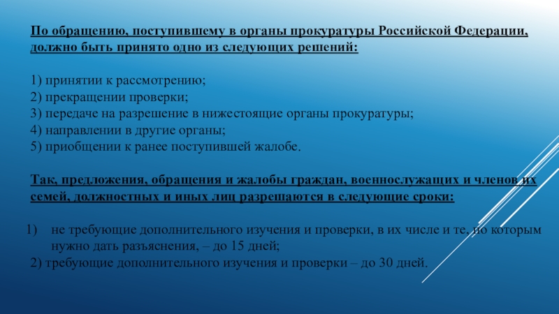 Слайд 15По обращению, поступившему в органы прокуратуры Российской Федерации, должно быть принято