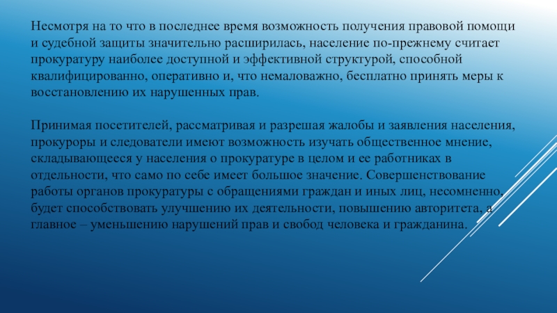 и судебной защиты значительно расширилась, население по-прежнему считает прокуратуру наиболее доступной и эффективной структурой, способной квалифицированно, оперативно и, что немаловажно, бесплатно принять меры к восстановлению их нарушенных прав.