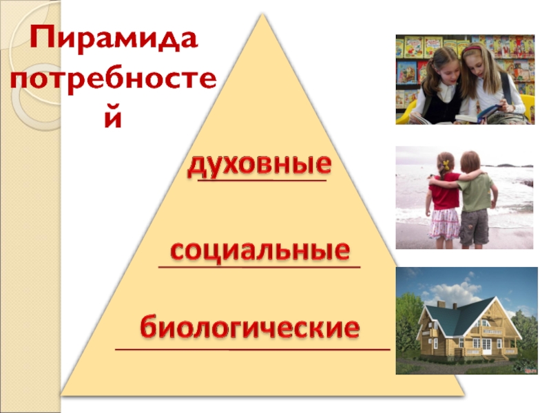 ПОДОБРАТЬ К ИЗОБРАЖЕНИЯМ НАЗВАНИЯ ПОТРЕБНОСТЕЙсоциальныедуховныебиологические123