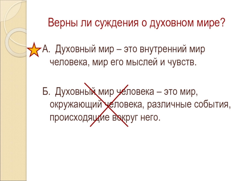 Верны ли суждения о духовном мире?А. Духовный мир – это внутренний мир человека, мир его мыслей и