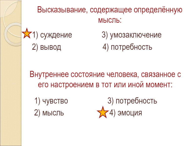 Высказывание, содержащее определённую мысль:1) суждение        3) умозаключение2) вывод