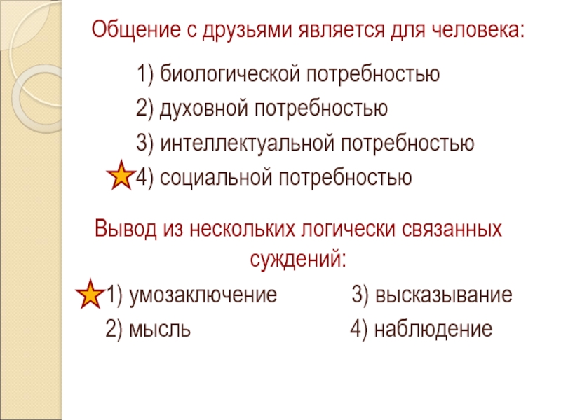 Общение с друзьями является для человека:1) биологической потребностью2) духовной потребностью3) интеллектуальной потребностью4) социальной потребностьюВывод из нескольких логически