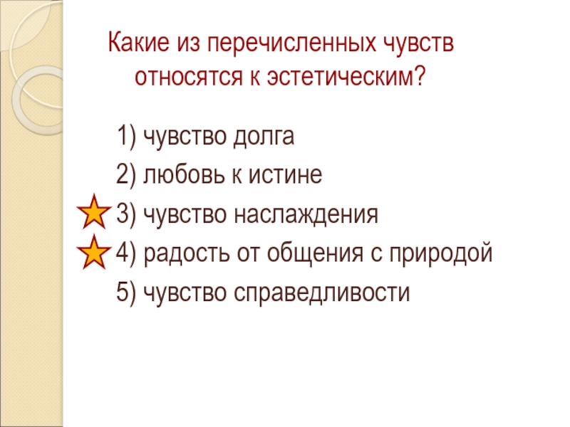 Какие из перечисленных чувств относятся к эстетическим?1) чувство долга2) любовь к истине3) чувство наслаждения4) радость от общения