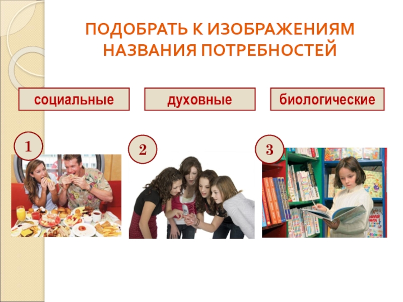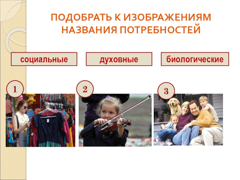 социальныедуховныебиологическиеПОДОБРАТЬ К ИЗОБРАЖЕНИЯМ НАЗВАНИЯ ПОТРЕБНОСТЕЙ123