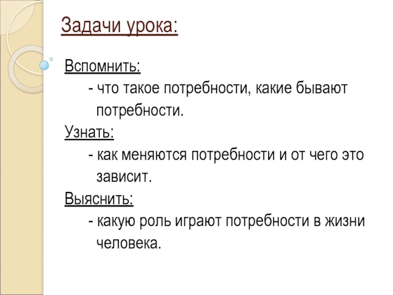 Задачи урока:Вспомнить: - что такое потребности, какие бывают потребности.Узнать: - как меняются потребности и от чего это зависит.Выяснить: - какую роль играют потребности в