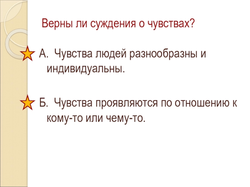 Верны ли суждения о чувствах?А. Чувства людей разнообразны и индивидуальны.Б. Чувства проявляются по отношению к кому-то или