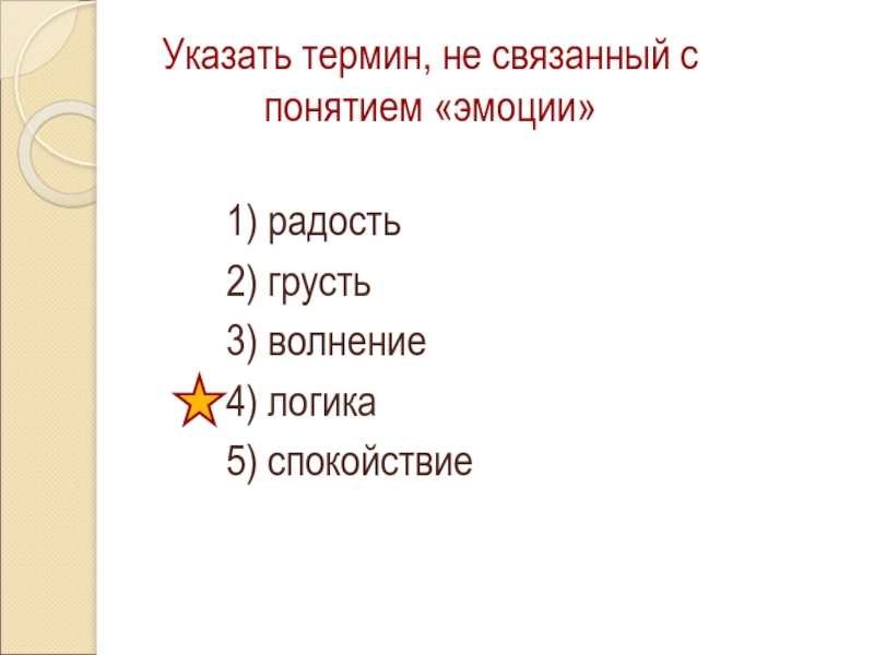 Указать термин, не связанный с понятием «эмоции»1) радость2) грусть3) волнение4) логика5) спокойствие