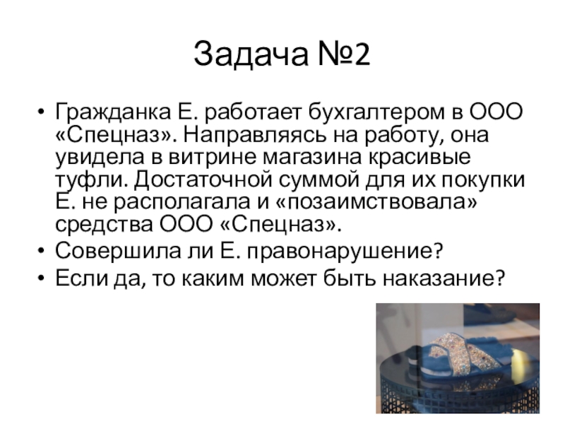 она увидела в витрине магазина красивые туфли. Достаточной суммой для их покупки Е. не располагала и «позаимствовала» средства ООО «Спецназ».