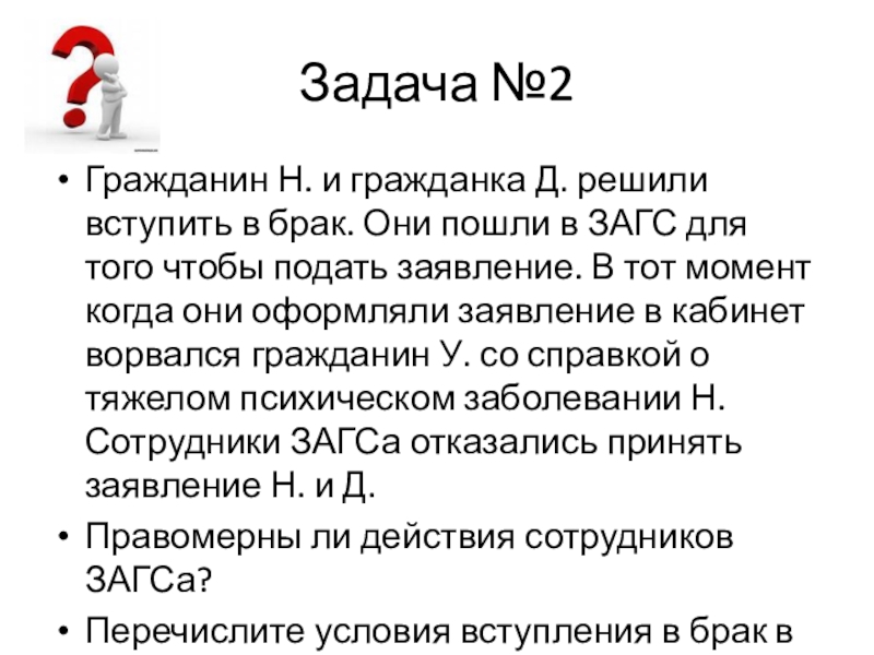пошли в ЗАГС для того чтобы подать заявление. В тот момент когда они оформляли заявление в кабинет ворвался гражданин У. со справкой о тяжелом психическом заболевании Н. Сотрудники ЗАГСа отказались принять заявление Н. и Д.