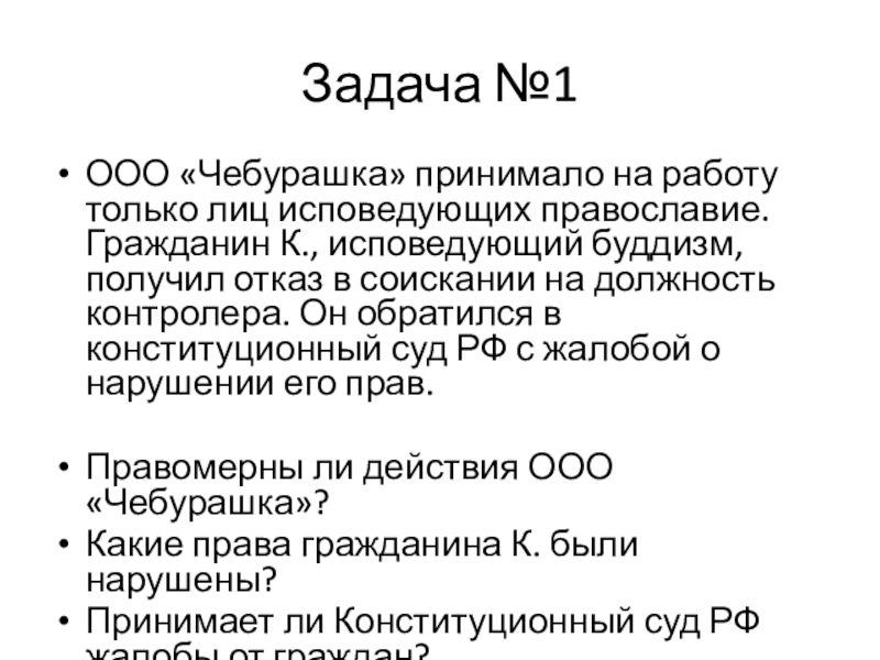 К., исповедующий буддизм, получил отказ в соискании на должность контролера. Он обратился в конституционный суд РФ с жалобой о нарушении его прав.