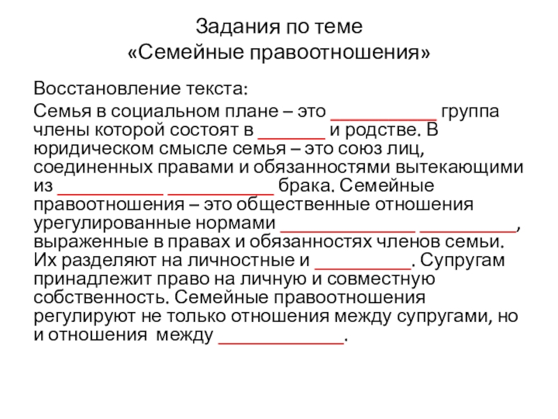 ___________ группа члены которой состоят в _______ и родстве. В юридическом смысле семья – это союз лиц, соединенных правами и обязанностями вытекающими из ___________ ___________ брака. Семейные правоотношения – это общественные отношения урегулированные нормами ______________ __________, выраженные в правах и обязанностях членов семьи. Их разделяют на личностные и __________. Супругам принадлежит право на личную и совместную собственность. Семейные правоотношения регулируют не только отношения между супругами, но и отношения между _____________.