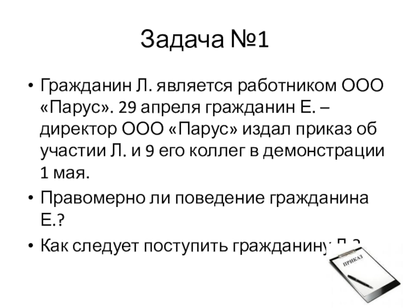 – директор ООО «Парус» издал приказ об участии Л. и 9 его коллег в демонстрации 1 мая.