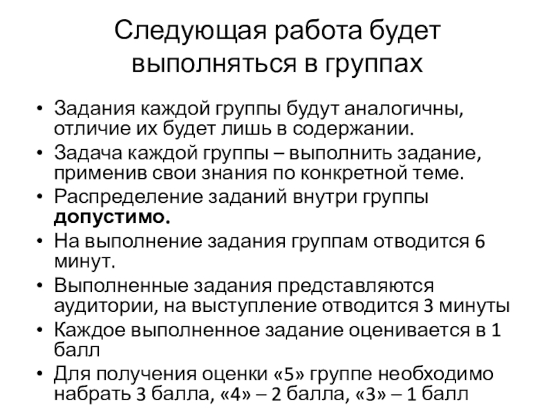 Для получения оценки «5» группе необходимо набрать 3 балла, «4» – 2 балла, «3» – 1 балл