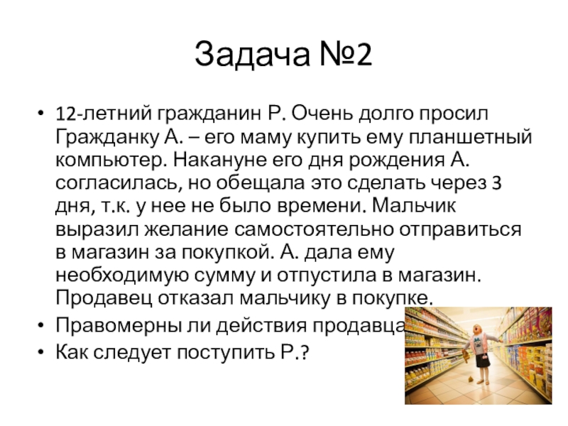 маму купить ему планшетный компьютер. Накануне его дня рождения А. согласилась, но обещала это сделать через 3 дня, т.к. у нее не было времени. Мальчик выразил желание самостоятельно отправиться в магазин за покупкой. А. дала ему необходимую сумму и отпустила в магазин. Продавец отказал мальчику в покупке.