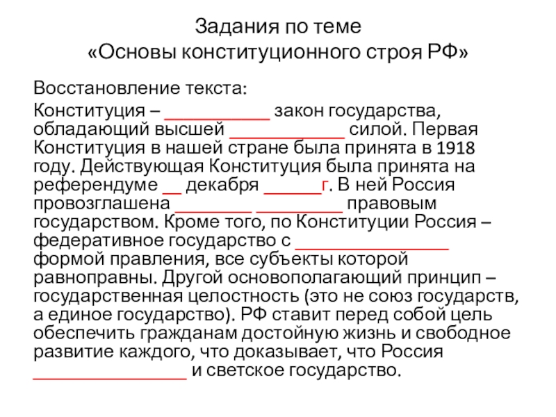 государства, обладающий высшей ____________ силой. Первая Конституция в нашей стране была принята в 1918 году. Действующая Конституция была принята на референдуме __ декабря ______г. В ней Россия провозглашена ________ _________ правовым государством. Кроме того, по Конституции Россия – федеративное государство с ________________ формой правления, все субъекты которой равноправны. Другой основополагающий принцип – государственная целостность (это не союз государств, а единое государство). РФ ставит перед собой цель обеспечить гражданам достойную жизнь и свободное развитие каждого, что доказывает, что Россия ________________ и светское государство.