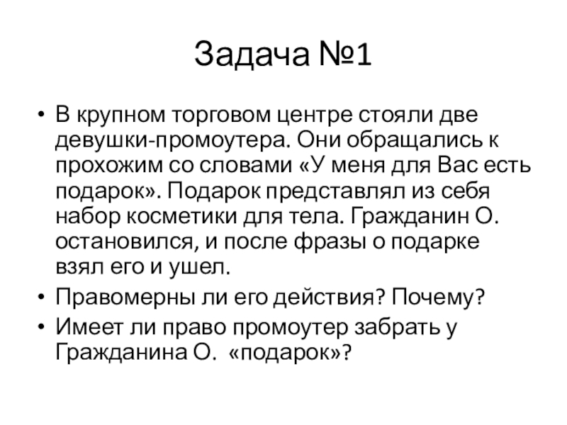 прохожим со словами «У меня для Вас есть подарок». Подарок представлял из себя набор косметики для тела. Гражданин О. остановился, и после фразы о подарке взял его и ушел.