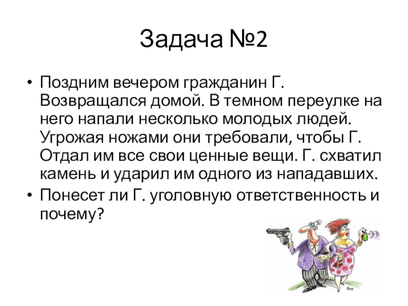 Поздним вечером гражданин Г. Возвращался домой. В темном переулке на