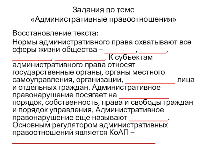 жизни общества – ________, _______, __________, _____________. К субъектам административного права относят государственные органы, органы местного самоуправления, организации, _____________ лица и отдельных граждан. Административное правонарушение посягает на _____________ порядок, собственность, права и свободы граждан и порядок управления. Административное правонарушение еще называют __________. Основным регулятором административных правоотношений является КоАП – _____________________________________