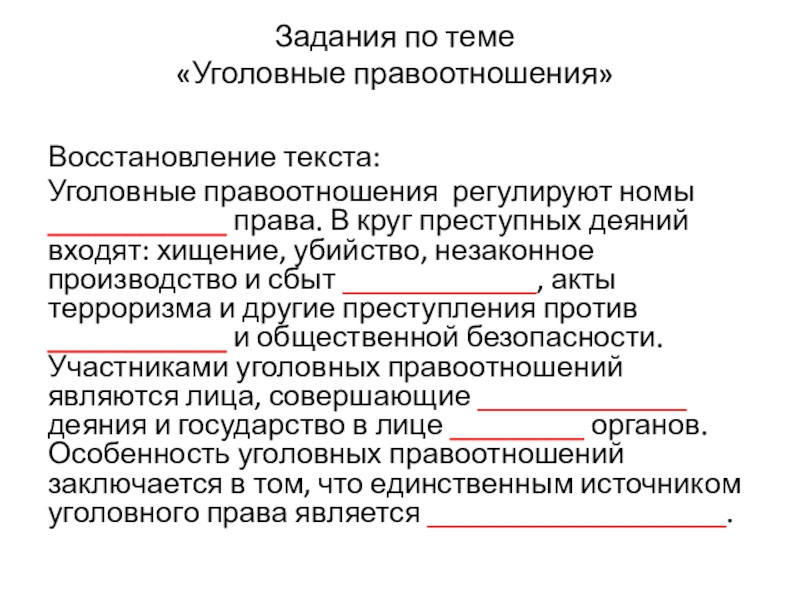 входят: хищение, убийство, незаконное производство и сбыт _____________, акты терроризма и другие преступления против ____________ и общественной безопасности. Участниками уголовных правоотношений являются лица, совершающие ______________ деяния и государство в лице _________ органов. Особенность уголовных правоотношений заключается в том, что единственным источником уголовного права является ____________________.