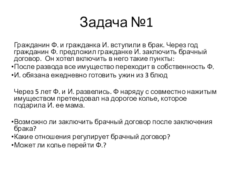 гражданин Ф. предложил гражданке И. заключить брачный договор. Он хотел включить в него такие пункты: