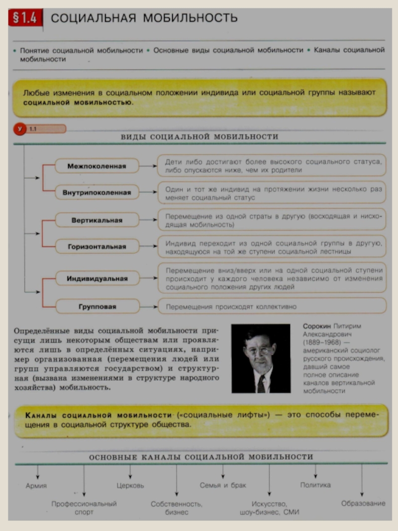 Например, канал мобильности – брак: девушка из провинции вышла замуж за владельца крупного столичного торгового комплекса; канал мобильности – образование и бизнес: мужчина окончил университет, начал собственное дело и через несколько лет стал финансово состоятельным человеком