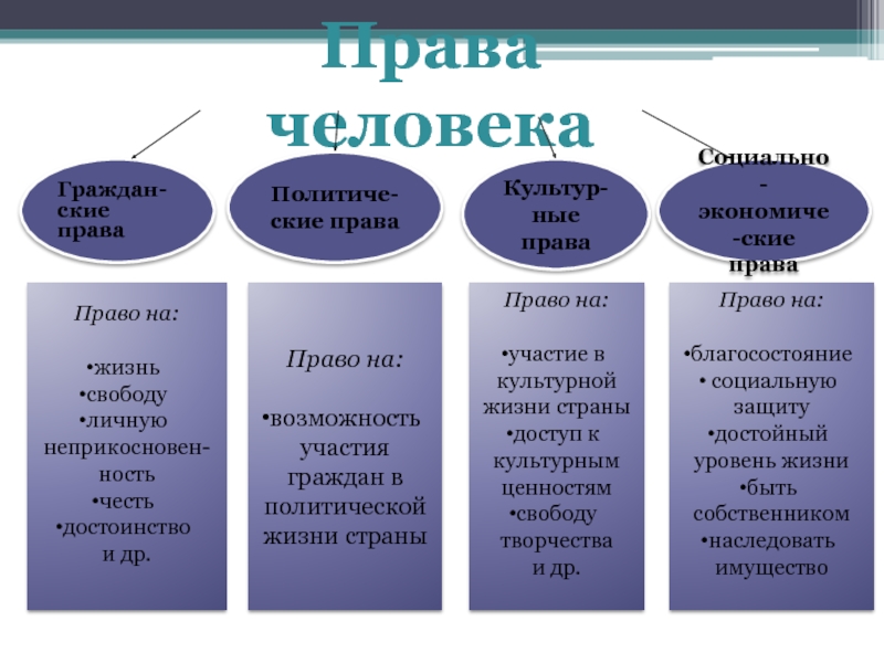 Права человекаПолитиче-ские праваГраждан-ские праваСоциально-экономиче-ские праваКультур-ные праваПраво на:  жизньсвободу личную неприкосновен-ностьчестьдостоинствои др. Право на:возможность участия граждан в