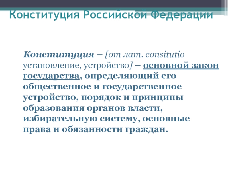 Конституция Российской Федерации  Конституция – [от лат. consitutio установление, устройство] – основной закон государства, определяющий