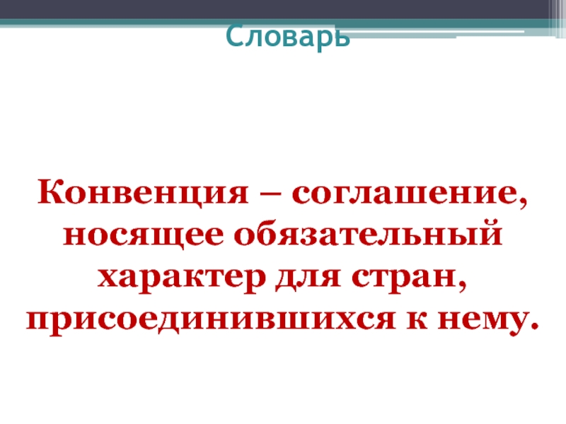 СловарьКонвенция – соглашение, носящее обязательный характер для стран, присоединившихся к нему.