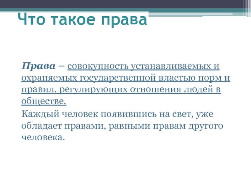 Что такое права Права – совокупность устанавливаемых и охраняемых государственной властью норм и правил, регулирующих отношения людей в обществе. Каждый человек появившись на свет, уже обладает правами, равными правам другого человека.