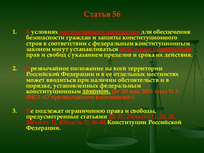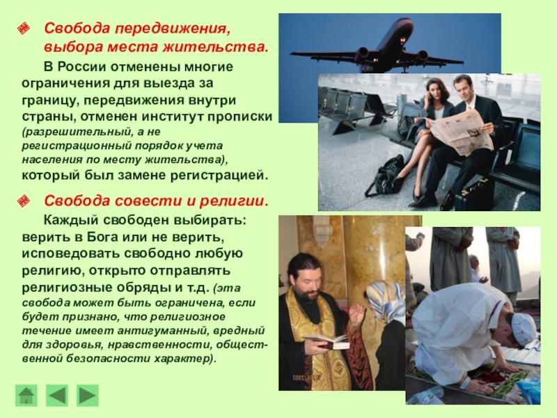 - право на свободу передвижения внутри страны, на выезд из неё и возвращение в неё (ст. 27);